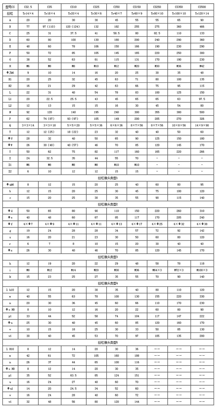 注:運(yùn)動(dòng)螺母尺寸中“()”內(nèi)的數(shù)字僅對(duì)滾珠絲杠型適用,且滾珠絲杠的“Φf”在外側(cè)有標(biāo)準(zhǔn)的沉孔,其中CS50型的“/”前為4005,“/”后為4010滾珠絲杠的螺母尺寸。